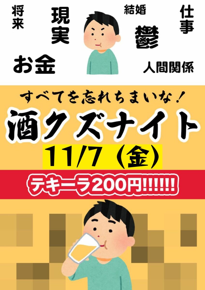 11月7日(金)第12回!酒クズナイト🥃テキーラ200円😆✨️