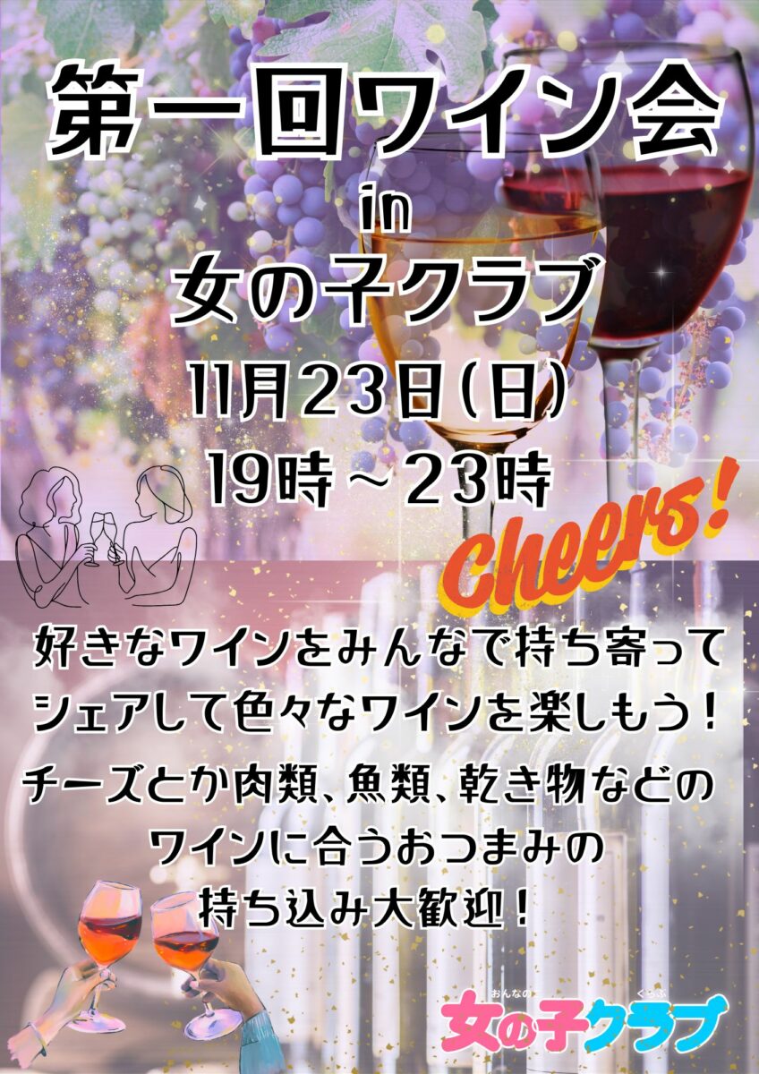 みなさんお待たせしました‼️11月23日(日)19時〜23時にて第一回ワイン会を開催いたします✨(※イベント後、そのまま朝5時まで営業しています)