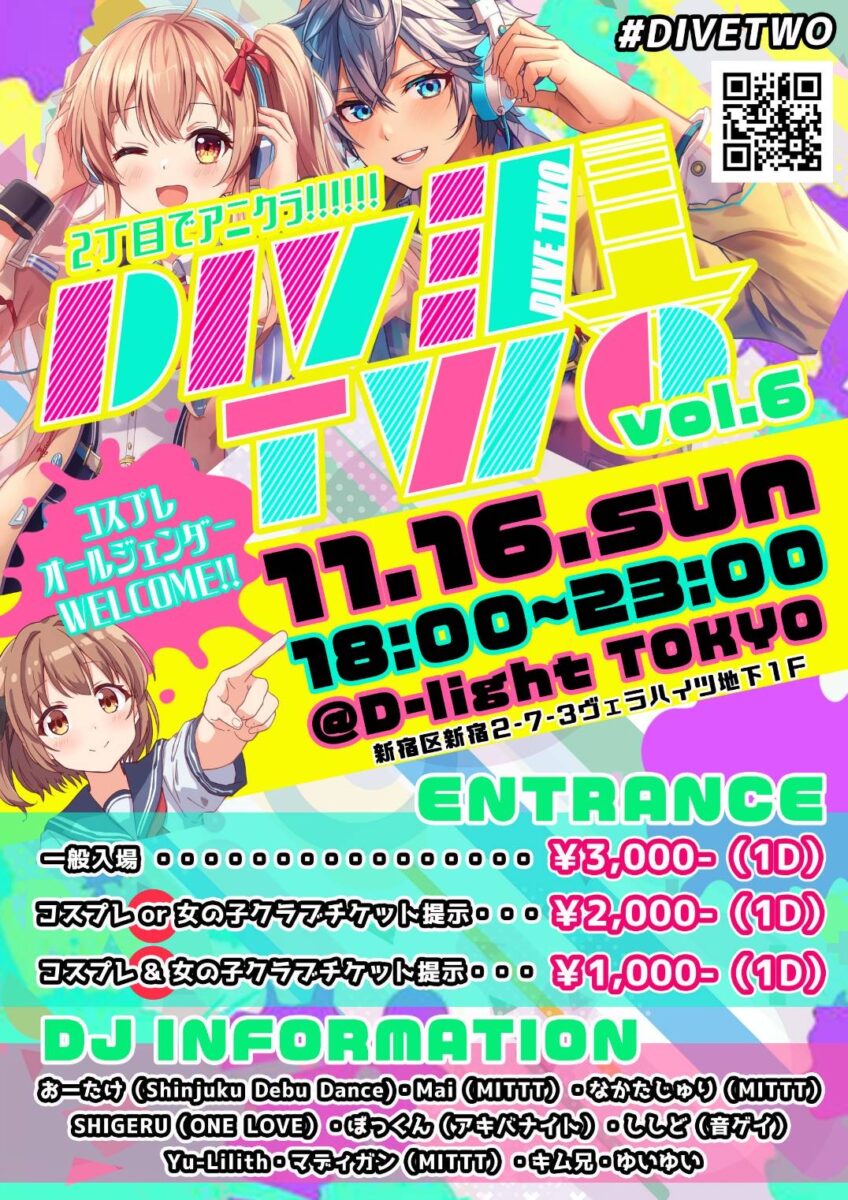 11月16日(日)新宿二丁目でアニクライベント DIVE→TWO(新宿2-7-3 ヴェラハイツ地下一階)が開催されます。会場ではみんながコスプレ衣装を着て集まってDJさんがアニソンを流して、交流して盛り上がろうというクラブイベントです✨主催:ゆいゆいさん