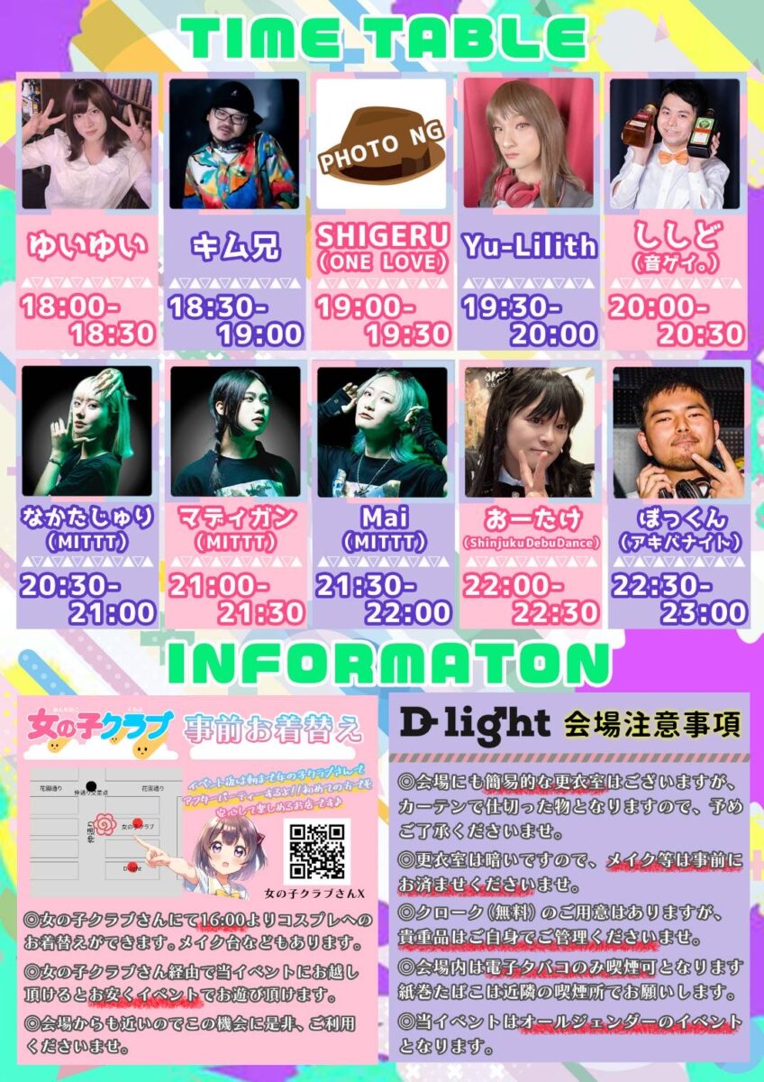 DIVE→TWOの会場は18時からオープンです。DIVE→TWOオープン前にお着替えをしたい方は、この日は女の子クラブを16時から開けていますのでぜひお着替え、メイクスペースとしてご利用くださいませ👩(ゆったり準備が出来るように、この日限定で女の子クラブではいつもより特別に広めスペースをご用意してます😊)
