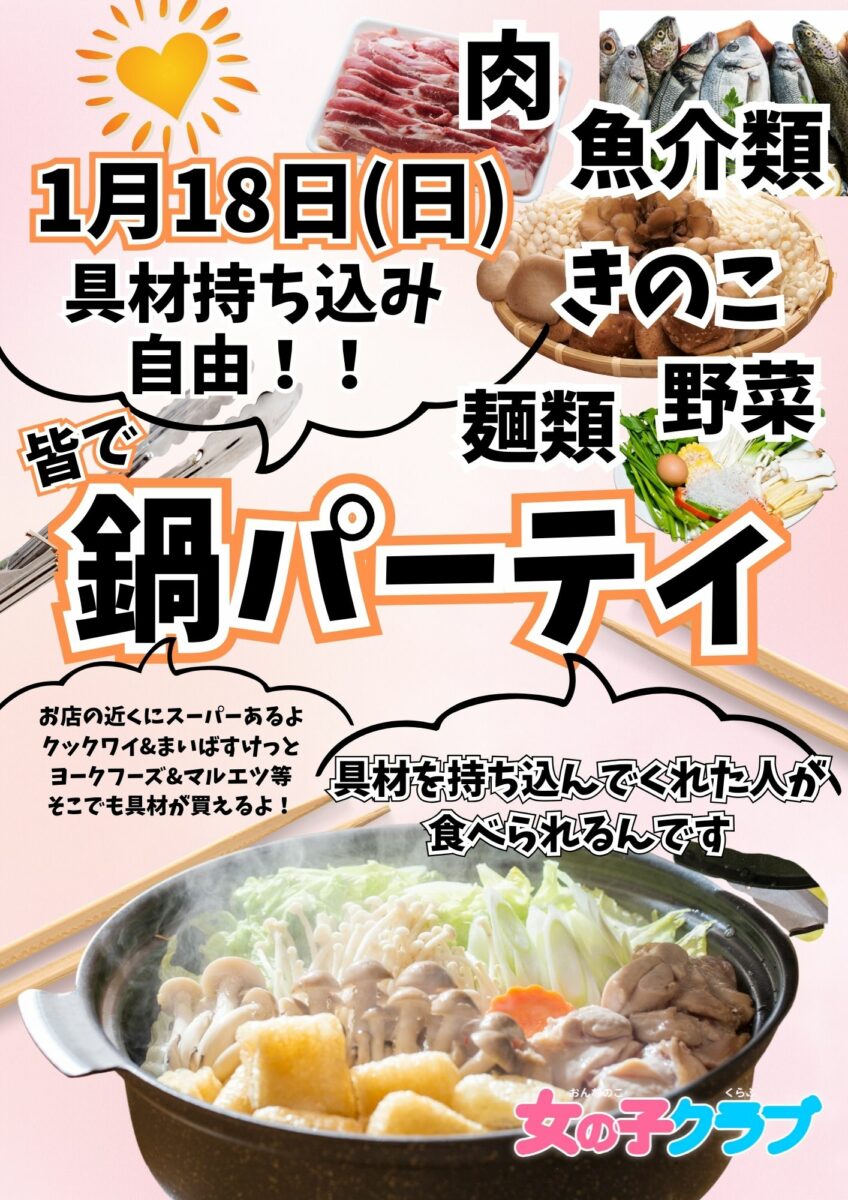1月18日(日)19時〜23時で鍋会を開催しています🍲(※イベント後はそのまま朝5時まで営業しています)