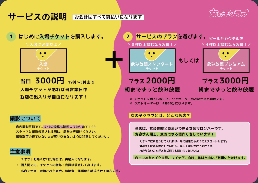 それ以外のドリンク、入場料、飲み放題料金の変更はございません。