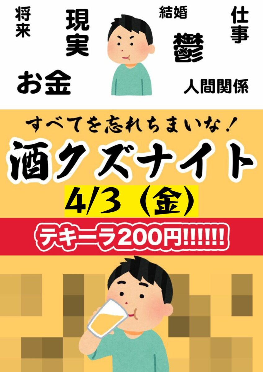 4月3日(金)第17回!酒クズナイト🥃テキーラ200円😆✨️アネホ1800 は500円🉐